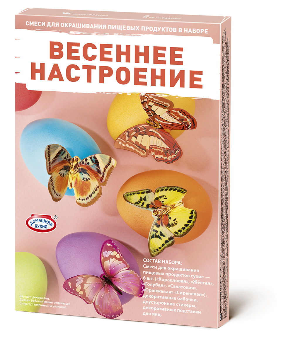 Смеси для окрашивания пищевых продуктов сухие — 6 шт. («Коралловая», «Жёлтая», «Голубая», «Салатовая», «Оранжевая», «Сиреневая»). МАССА НЕТТО — 4,2 Г (6 ШТ. X 0,7 Г). Состав: мальтодекстрин, разрыхлитель (E500ii), загуститель (E1400), стабилизатор (Е470а), носитель (E460i), красители пищевые (Е102, Е110, Е122, Е124, Е132, Е133, Е151). Пищевая ценность в 100 г продукта: углеводы — 91 г, белки — 0 г, жиры — 0 г, соль — 0 г. Энергетическая ценность на 100 г продукта: 360 ккал/1510 кДж. Декоративные бабочки (картон) — 4 шт. Двусторонние стикеры (вспененный полиэтилен, бумага) —1 лист. Декоративные подставки для яиц (картон) — 1 блок.