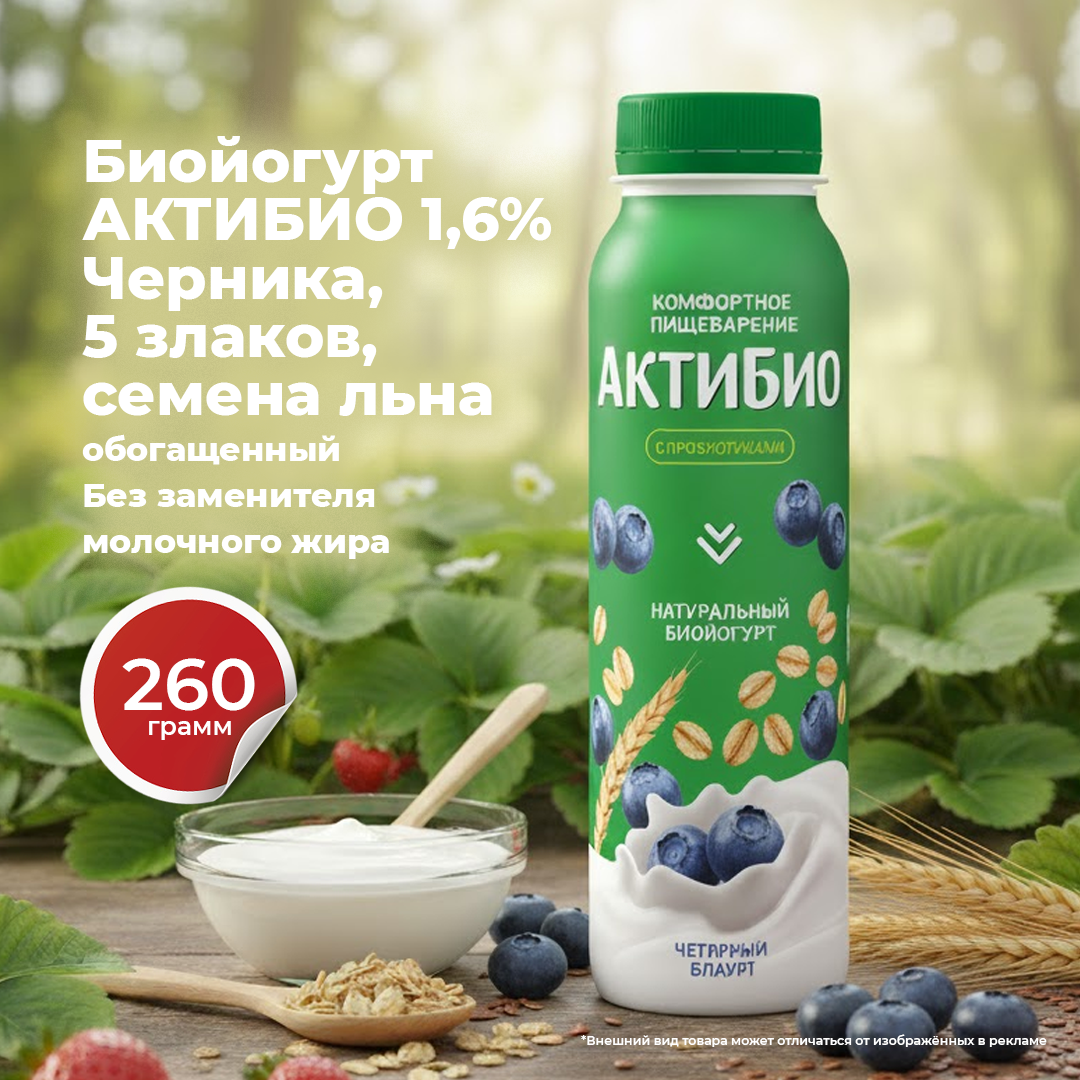 Биойогурт АКТИБИО 1,6% 260г Черника, 5 злаков, семена льна обогащенный Без ЗМЖ