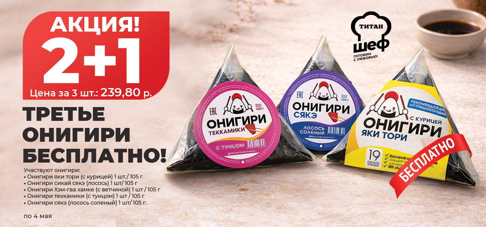 Любите онигири? У нас для вас суперпредложение: покупайте 2 онигири — и третий достаётся вам абсолютно бесплатно!